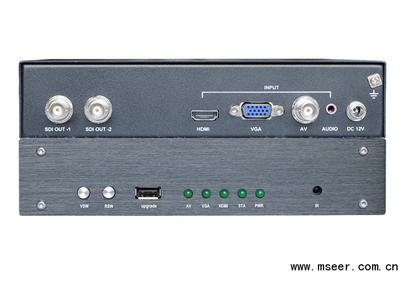 MHTS101是一款多功能轉(zhuǎn)換器。專用于將單路高清晰多媒體接口HDMI或VGA或模擬AV(CVBS)信號(hào)轉(zhuǎn)換為高清數(shù)字分量串行接口SDI信號(hào)的設(shè)備。該設(shè)備集成SDI發(fā)送器及HDMI解調(diào)器,可方便地將HDMI(VGA、CVBS)信號(hào)轉(zhuǎn)為SDI信號(hào),同時(shí)會(huì)將HDMI所帶音頻信號(hào)分離轉(zhuǎn)換后嵌入到SDI信號(hào)中,或?qū)GA,AV(CVBS)外置音頻嵌入到SDI信號(hào)中,以實(shí)現(xiàn)聲音及圖像同步傳輸。用戶可以強(qiáng)制指定SDI輸出格式,以適應(yīng)不同應(yīng)用環(huán)境。產(chǎn)品主要用于高清視頻信號(hào)遠(yuǎn)距離傳輸,安防監(jiān)控視頻信號(hào)遠(yuǎn)距離傳輸、大型演出中高清視頻信號(hào)傳輸?shù)?/span>