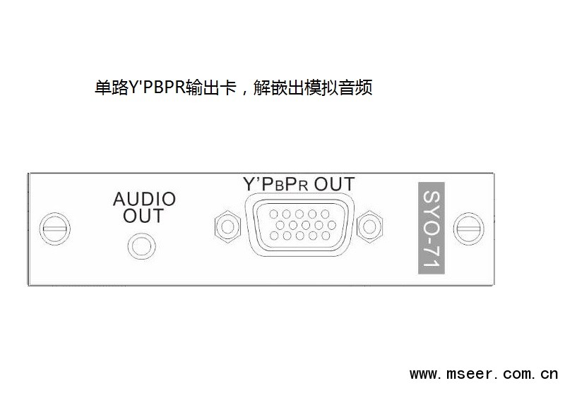 SYO-71 Y'PBPR單通道變換輸出卡,配合SMD主機使用,采用獨立板卡設(shè)計,每塊卡支持1路Y'PBPR輸出,解嵌出模擬音頻,支持變換至最高1920x1200P60的數(shù)字高清圖像傳輸.