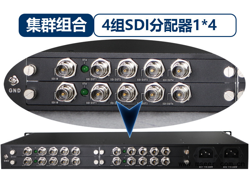 ●將4組3G-SDI分配器集成在一個(gè)標(biāo)準(zhǔn)機(jī)箱(1U)中,能將4路高清視頻,每路分別無損分配至4個(gè)視頻顯示設(shè)備;