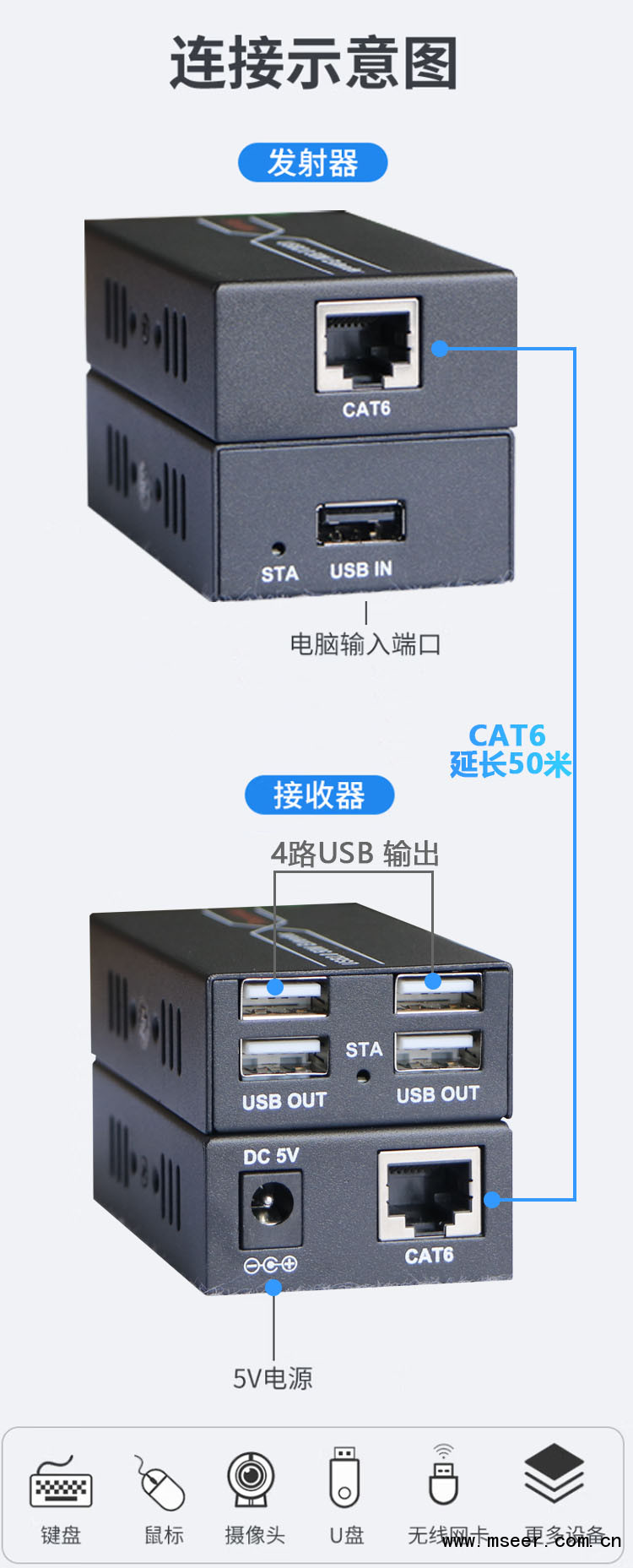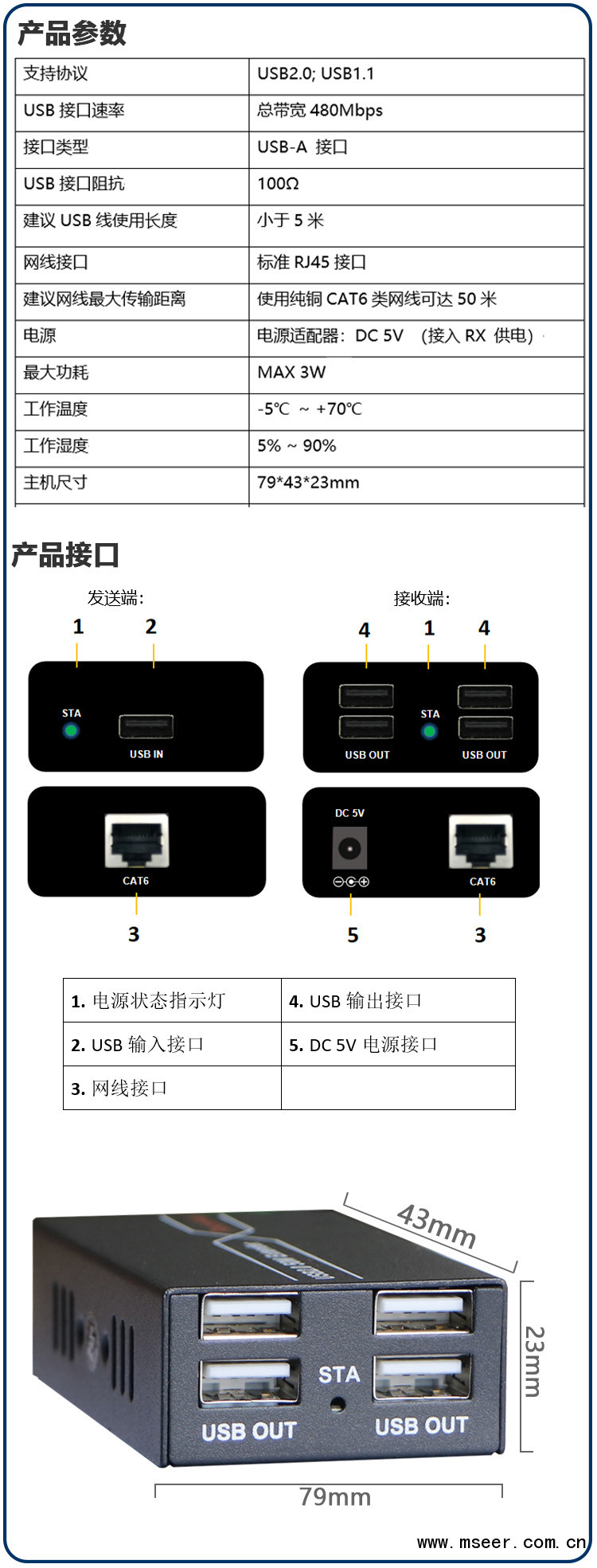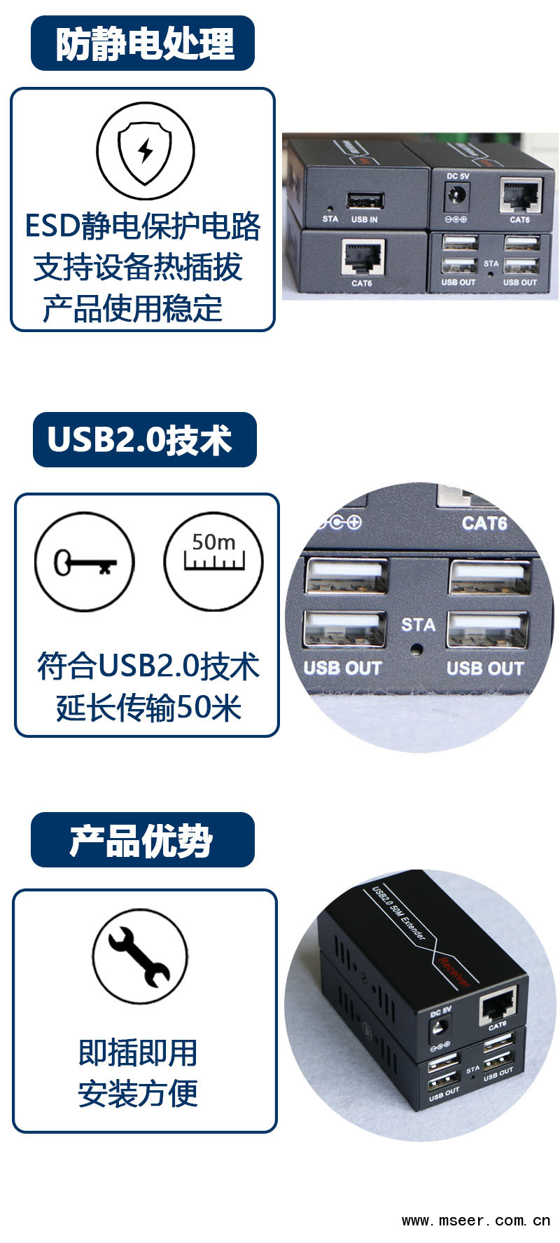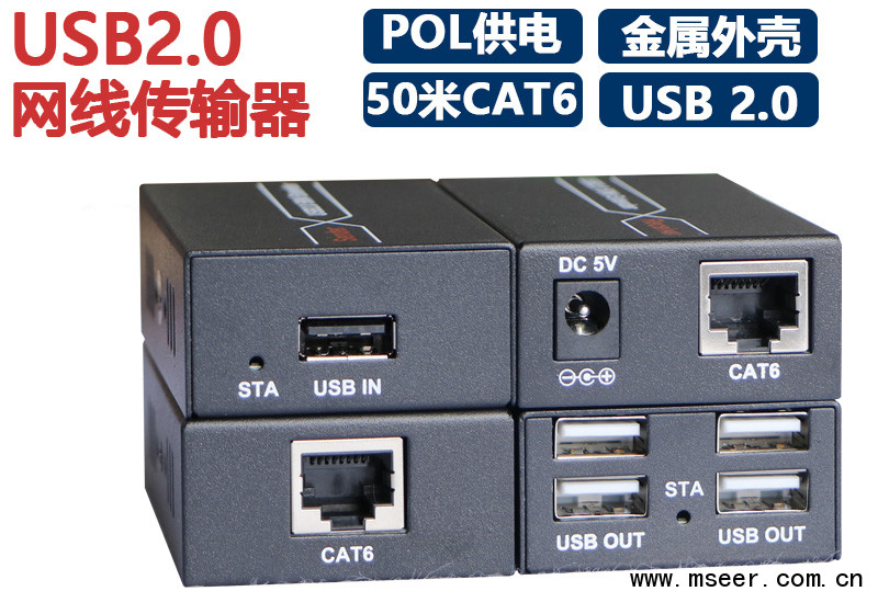 ☆支持通過單根CAT5/5e/6網(wǎng)線,將USB信號(hào)延長50米