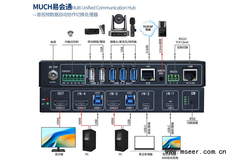 MUCH易會通具備豐富的接口,涵蓋 HDMI、USB(USB-A、USB-B、USB-C)以及千兆網(wǎng)口等常用辦公設(shè)備接口,滿足多種場景下的多媒體協(xié)作應(yīng)用需求。設(shè)備支持 4 路輸入(2 路 HDMI 含 USB數(shù)據(jù),2 路 USB-C)和 1 路 HDMI 4K 輸出。其中 1 路 USB-C 輸入支持最大 60W PD反向供電。